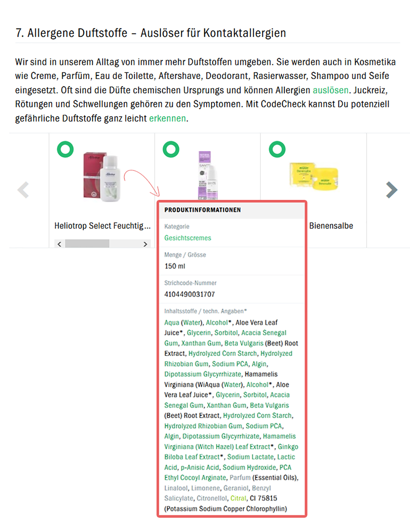 Ausschnitt aus einem Beitrag von Codecheck mit kritischer Betrachtung von Duftstoffen,