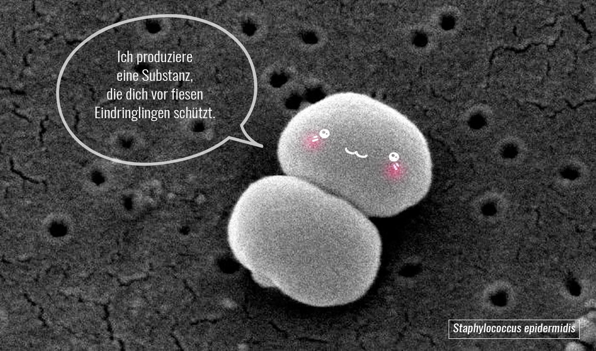 Trotz der Tatsache, dass unsere Haut permanent Mikroorganismen ausgesetzt ist, kann sie zwischen harmlosen und schädlichen Ankömmlingen unterscheiden. Hilfestellung leistet in solchen Fällen Staphylococcus epidermidis., welches in der Lage ist die Besiedlung durch Eindringlinge zu verhindern.