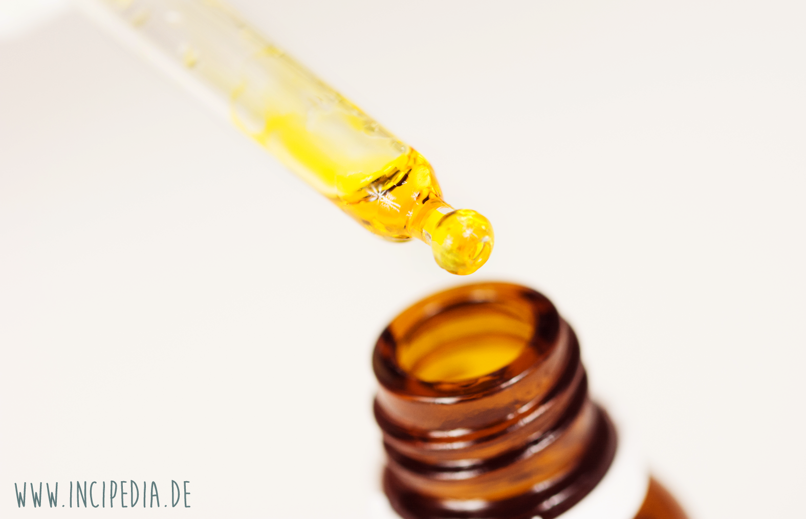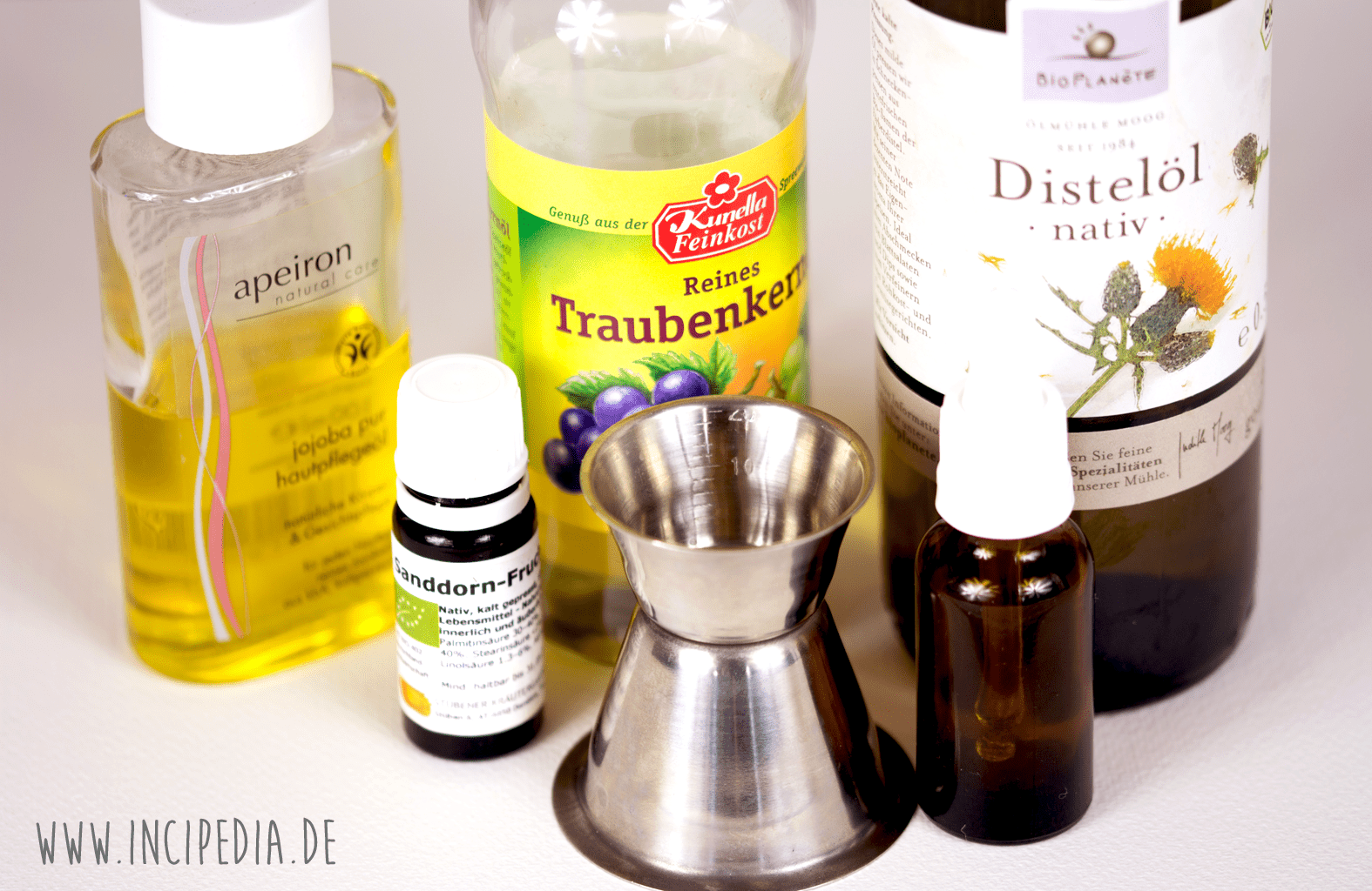 Jojobaöl bildet unser Basisöl. Es ist sehr oxidationsstabil und wird deswegen nicht so schnell ranzig. Somit bewahrt es unsere Mischung gut davor schlecht zu werden. Außerdem zieht es gut in die Hornschicht der Haut ein und breitet sich darin aus. Dadurch verbessert es deren Elastizität. Traubenkernöl ist ein sehr leichtes Öl, welches gut den Talgfluss reguliert und somit Mitessern und Pickelchen entgegen wirkt. Distelöl hat die Eigenschaft schnell aber nicht allzu tief in die Haut einzuziehen. Dadurch schützt es gut vor Feuchtigkeitsverlust. Aufgrund seiner Fettsäure-Zusammensetzung ist es ein perfektes Öl für normale, fettige und Mischhaut. Sanddorn-Fruchtfleischöl ist unser Wirkstofföl. Ihr solltet dieses Öl nicht allein auf eurer Haut nutzen, weil es immer noch einige Fruchtsäuren enthält und somit in dieser konzentrierten Form reizend sein könnte. Die Einsatzkonzentration darf bei diesem Öl höchstens bei 5% liegen, da die Färbung sonst zu stark wäre.