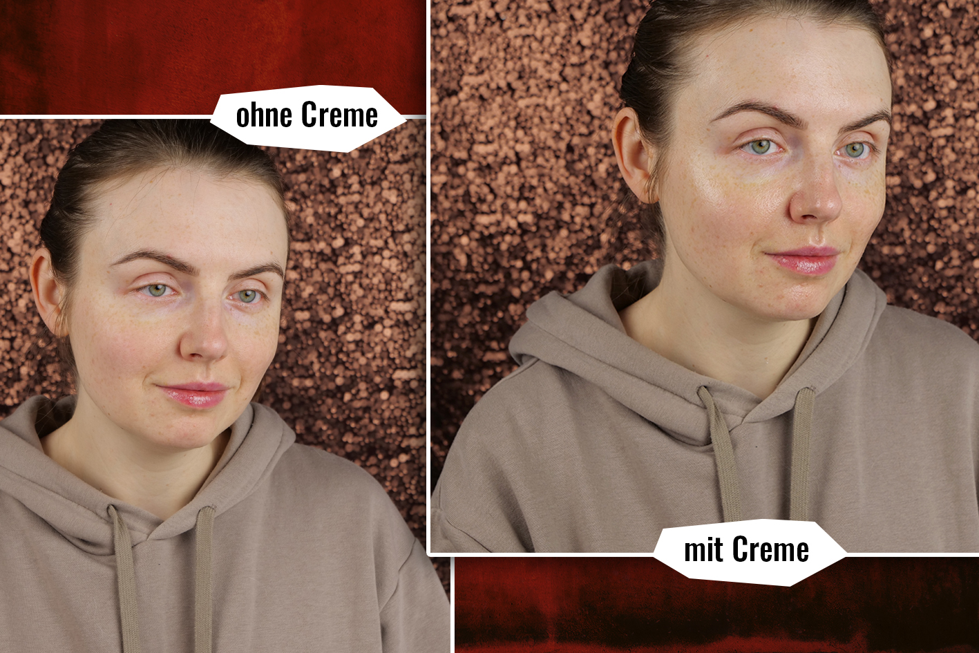 Meine Haut ohne die Creme und mit Incipedia Gesichtswasser + Creme