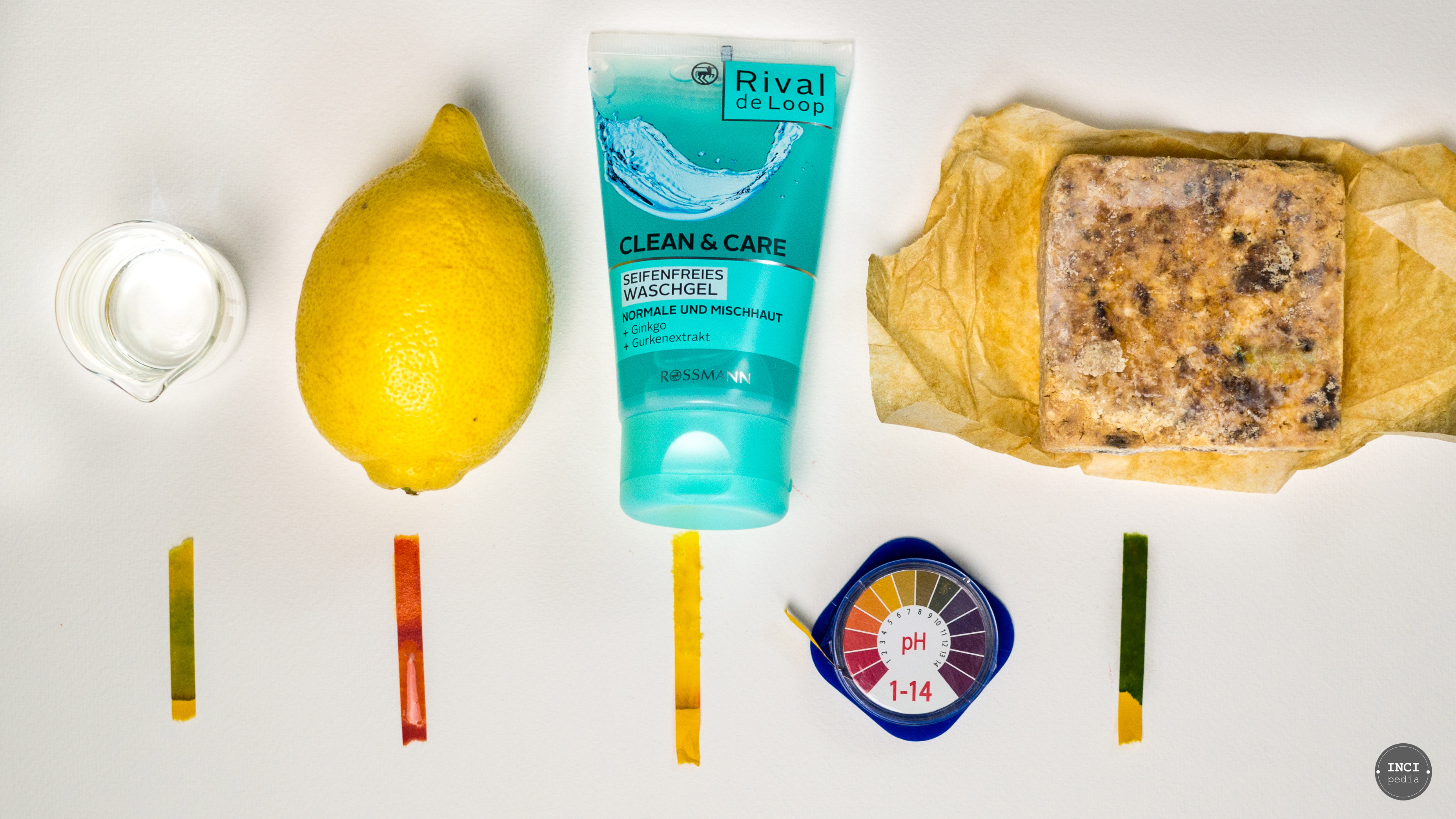 pH-Werte verschiedener Produkte von links nach rechts: Leitungswasser, Zitronensaft, Syndet, Seife