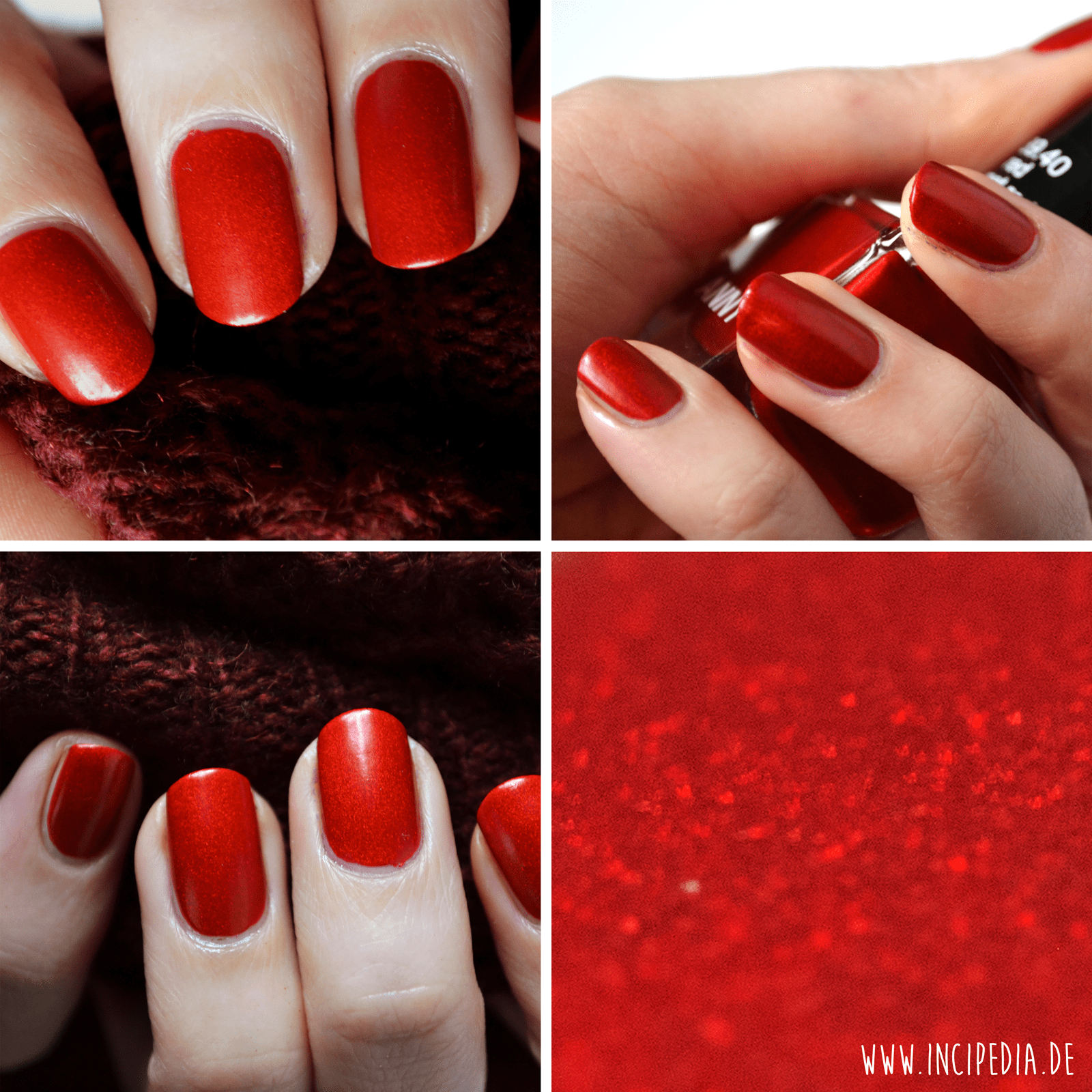 Heute möchte ich euch einen wunderschönen Lack zeigen, der einfach wunderschön ist! Warum? Schaut ihn euch doch einfach an! Ein herrliches Rot mit kleinen, süßen Glitterteilchen und einem seidigen Finish. Der Auftrag war perfekt und gleichmäßig. Nach zwei Schichten deckend. Ein Überlack hätte den Effekt verändert, weshalb ich ihn weggelassen habe. Wisst ihr, was das einzige Problem ist? Dieser „Rote Teppich“ kostet 9,99 EUR. Ja, da muss man schon zweimal überlegen. Aber wozu hat man einen aufmerksamen Freund? 😀 Der Gute hat ihn mir einfach kurzerhand geschenkt. Ich liebe ihn! Und meinen Freund natürlich auch! Wie gefällt euch dieses feine Rot?