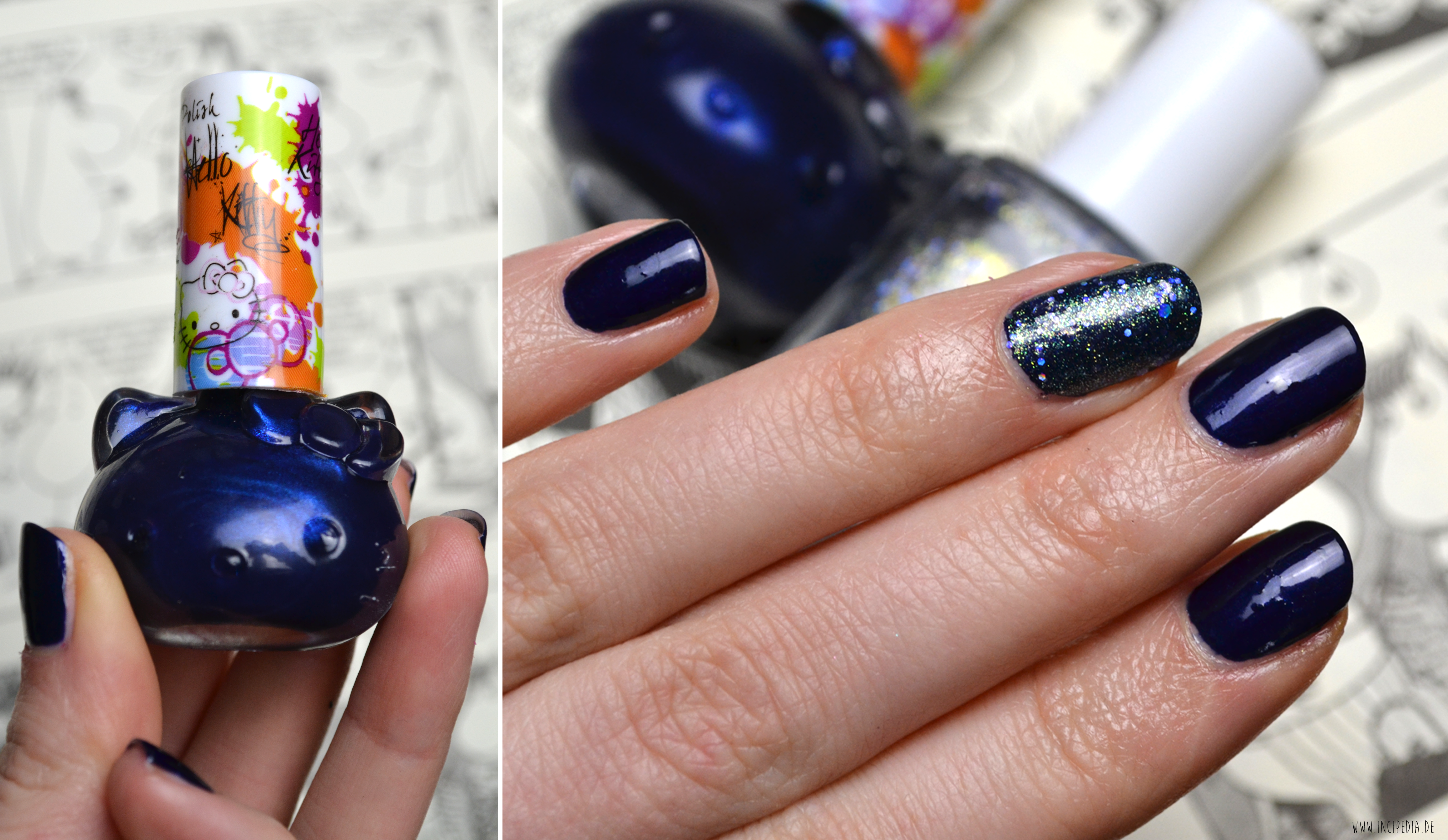 Letztens im TKMaxx entdeckte ich diese Nagellackflasche. Nein, ich bin kein Hello-Kitty-Fan, aber die Form gefiel mir einfach. Recht dekorativ und niedlich. Die Farbe ist sicherlich nichts Besonderes (ein Tintenblau), aber aufgrund der ungewöhnlichen Form musste ich dieses Fläschchen für drei Euro mitnehmen. Das Lackieren war jedoch eine Qual. Der Pinsel ist vieeel zu kurz und für meinen Geschmack zu dünn. „Respect“ präzise aufzutragen fiel mir unfassbar schwer. Dabei kann ich behaupten das doch relativ gut zu beherrschen. Die Farbe war deckend in einer Schicht. Ich habe jedoch zwei lackiert, um mehr Intensität herauszukitzeln. Ich habe übrigens noch so ein Kätzchen gekauft. Natürlich in einer anderen Farbe. Auf dem Ringfinger habe ich noch eine Schicht Essie „On a Silver Platter“ aufgetragen. Wie gefällt’s euch? Hättet ihr den Nagellack auch mitgenommen, weil er so süß ausschaut?