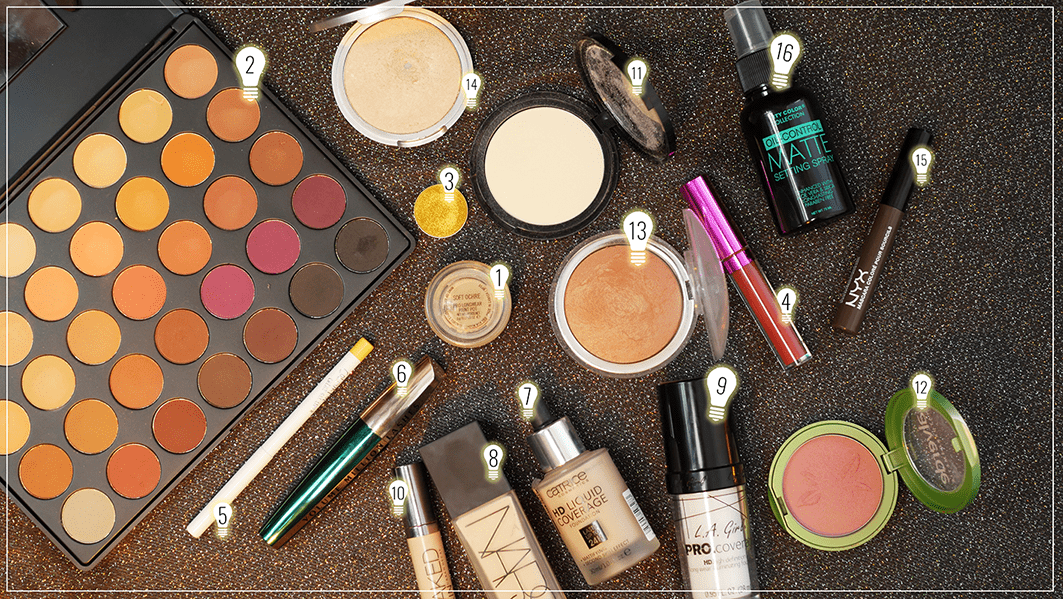 1. MAC Paint Pot Soft Ochre // 2. Kara Beauty Natural Matte Eyeshadow Palette – ES03 // 3. MUG Foiled e/s Fortune Teller // 4. L.A. Splash Smitten Liptint Mousse Sculpt // 5. Colour Pop Creme Gel Liner Punch // 6. L’oreal Volume Million Lashes Mascara Katzenblick // 7. Catrice HD Liquid Coverage Foundation 010 // 8. NARS All Day Luminous Weightless Foundation Siberia // 9. L.A. Girl Pro Coverage HD Foundation White // 10. Urban Decay Naked Skin Concealer Fair Neutral // 11. NYX HD Powder Banana // 12. Alverde Rouge Pretty Terra // 13. Catrice Sun Mineral Bronzing Powder 010 // 14. The Balm Mary-Lou Manizer // 15. NYX Brow Mascara Black // 16. City Color Collection Oil-Control Matte Setting Spray
