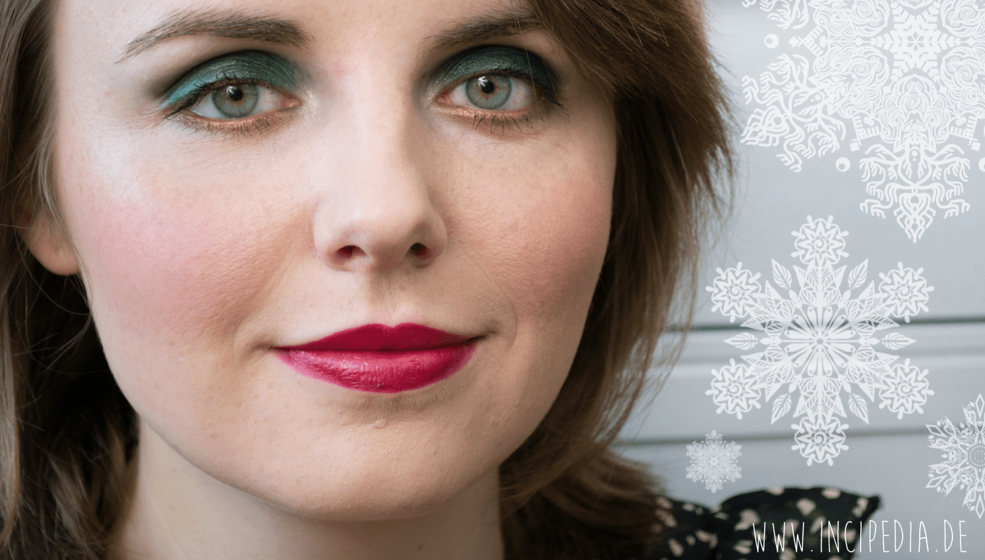 Auf Magimania kann man gerade ein hübsches Beauty-Päckchen gewinnen, indem man einen Festtags-Look nachschminkt. Ich entschied mich für diesen hier, den ich ein wenig abgewandelt habe. Durch das sattere Grün aus der Sleek Ultra Mattes V2 Palette sieht meiner so farbenfroh aus. Im Nachhinhein würde ich einen Nude-Lippenstift dazu wählen, weil’s einfach natürlicher aussieht und so der Fokus mehr auf den Augen liegt und ich mich nicht zu verkleidet fühle. Und was ich auch nicht nochmal tun würde: den NYX Jumbo Pencil in Rocky Mountain Green als Lidschatten-Base verwenden. Dadurch kriecht alles in die Lidfalten. zudem gefällt mir die Velvet Foundation von Catrice absolut nicht. Sie betont Fältchen und trockene Stellen viel zu sehr. Hier habe ich sie mit der Rival de Loop Natural Lift Foundation gemischt, sonst hätte das Ergebnis ein wenig schlimmer ausgeschaut. Am Ende des Abends hatte ich die Foundation überall: in den Poren, in den Fältchen, hinter den Nasenflügeln… wirklich überall, nur nicht da wo sie sein sollte. Auch bei dem Lippenstift bin ich zwiegespalten. Ich mag den Rihanna-Lipstick von Mac gerne, aber auch er kriecht ohne Lipliner extrem in umliegende Fältchen und franst so aus. Auf die Schnelle hatte ich nur den Lipliner von Flormar in einem beerigen Rot gefunden, weshalb der Lippenstift bläulicher wirkt als er in Wirklichkeit ist.
