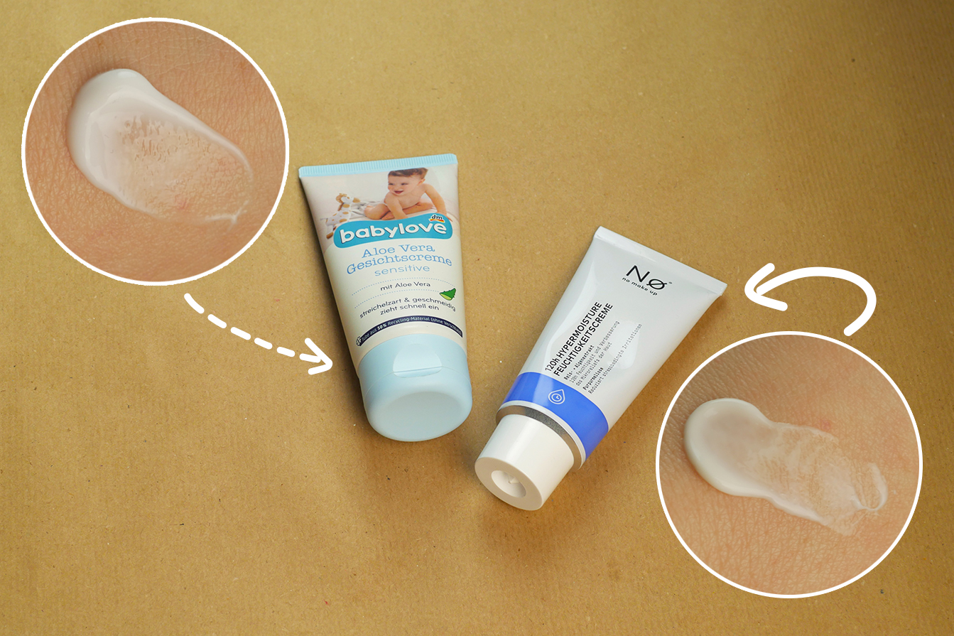 Auch wenn die Formulierung nicht identisch ist, setzen beide Cremes auf eine ähnliche Wirkung. Sowohl die Gesichtscreme von babylove als auch die Feuchtigkeitscreme von No Make Up enthalten feuchtigkeitsbindende Inhaltsstoffe – hier hauptsächlich Glycerin. Beide Produkte sollen schlichtweg den Feuchtigkeitsgehalt in der Haut erhöhen. Außerdem finden sich in beiden Cremes keinerlei deklarationspflichtige Duftstoffe. Wer jedoch sehr empfindliche Haut hat, sollte auf den Purpurmelissenextrakt (Agastache Mexicana Flower/Leaf/Stem Extract) in der 120 h Hypermoisture Feuchtigkeitscreme von No Make Up achten – dieser enthält natürlicherweise noch Duftstoffe. Die Textur der babylove Aloe Vera Creme ist der von No Make Up sehr ähnlich. Was zunächst als „normale“ Creme anmutet, wird nach dem Verreiben wässrig-leicht und mattierend.