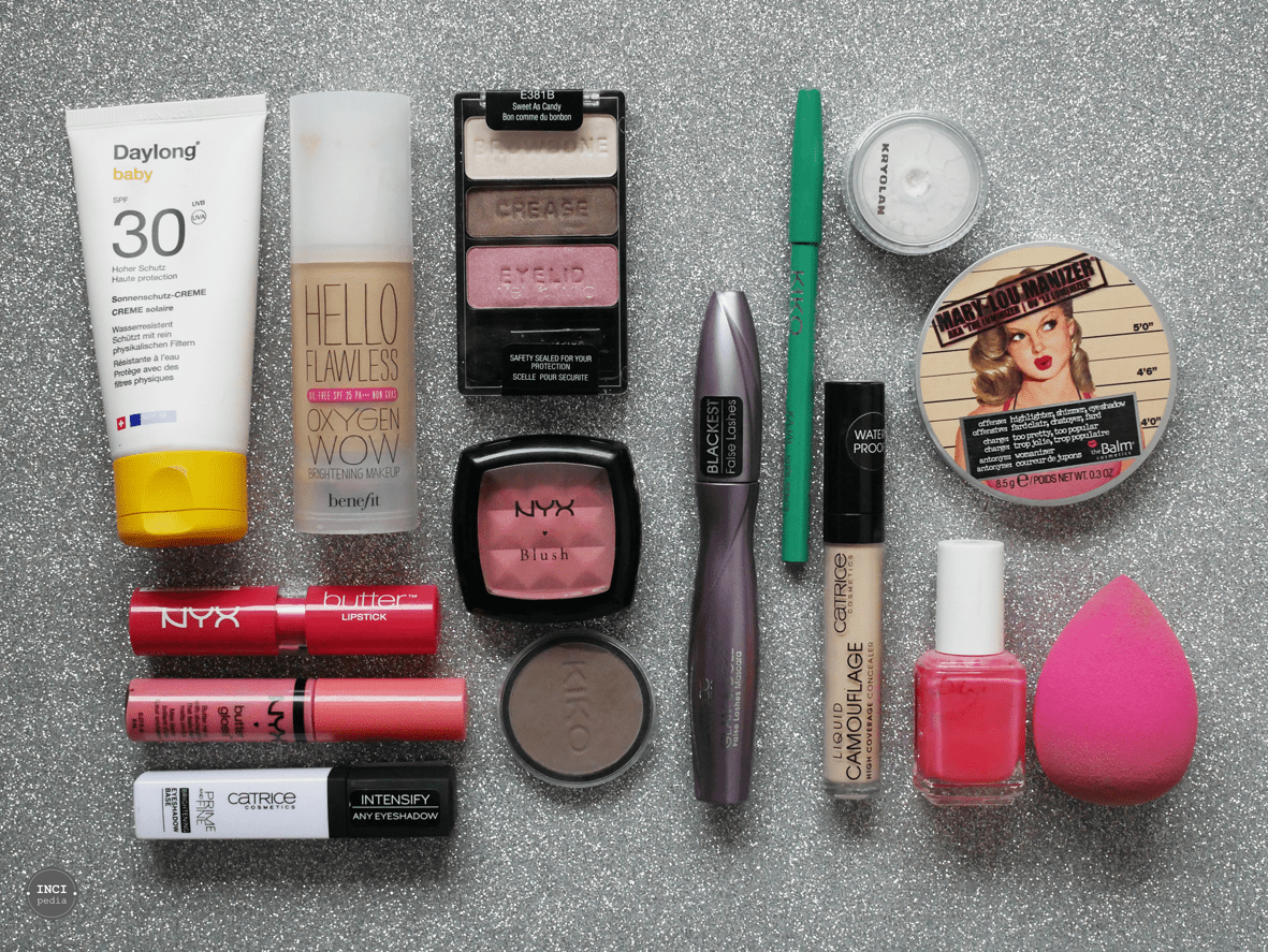 Benefit Oxygen Wow Foundation Ivory // Daylong Baby Sonnenschutz SPF 30* // Catrice Eyeshadowbase // Wet ’n‘ Wild Sweet as Candy Palette* // Catrice Liquid Camouflage 005 // Catrice Glam Doll Mascara // The Balm Mary Lou-Manizer* // NYX Stay Matte But Not Flat Powder Foundation Ivory* // NYX Blush Mauve* // NYX Butter Lipstick Little Susie* // NYX Butter Lipgloss Maple Blondie* // Kiko Kajal 111 // Kiko e/s 239 // Kryolan Glamour Sparks Red // Catrice Augenbrauenpuder // L’oreal Brow Artist Plumper in Brown // Essence Fixierspray // Essie Cute As A Button // Beautyblender*