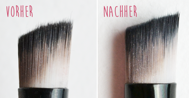 Wenn man gaaanz genau hinsieht, erkennt man dass der Pinsel nach der Anwendung mit dem Reiniger ein wenig von seiner Bräunlichkeit verloren hat. Nachdem ich ihn mit einem Kosmetiktuch abgetupft habe, waren tatsächlich Lidschattenreste darauf zu sehen. Aber viel war’s wirklich nicht. Leider habe ich auch so mein Problem mit diesem Sprühding, weil ich das Gefühl habe mehr von der Lösung überall zu versprühen außer direkt auf den Pinsel selbst. Bei diesem Vorgang geht so viel Produkt verloren, was ich irgendwie blöd finde.