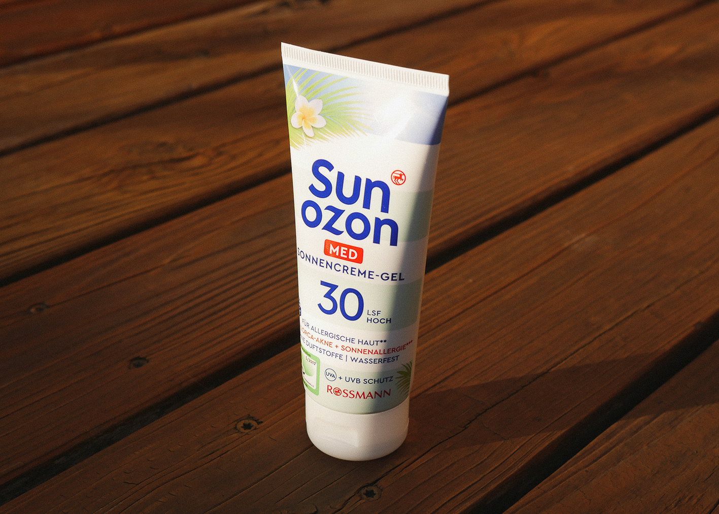 Sun Ozon Med Sonnencreme-Gel auf Holzgrund