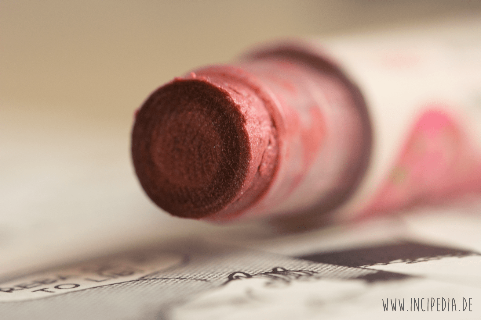 Erste Zutat ist Olivenöl, dann folgt Macadamianussöl und Sheabutter. Sheabutter ist sehr gut darin Feuchtigkeit in unserer Haut zu bewahren, genauso wie die vielen wachsigen Zutaten und das Jojobaöl. Die Öle verhelfen dabei das Produkt schön gleitfähig zu machen. Kaliglimmer (Mica) gibt ein wenig Schimmer und das Eisenoxid (Eisenoxidrot) die Farbe. Die Lippenpflege duftet herrlich nach Hibiskus, obwohl keine deklarierten Duftstoffe drin sind. Wobei wir wissen, dass sobald ein Inhaltsstoff unter 0.001 % liegt, darf Aroma oder Parfum stattdessen in der Liste stehen, solange es sich nicht um Allergene handelt. Würde da „Natürliches Hibiskus-Aroma“ stehen, wären 95% des Aromas auch aus der Hibiskus-Blüte gewonnen. Vitamin E hilft gegen das Ranzigwerden und Stevia gibt dem Ganzen Süße. Die Inhaltsstoffe sind also in Ordnung und machen einen guten Eindruck!