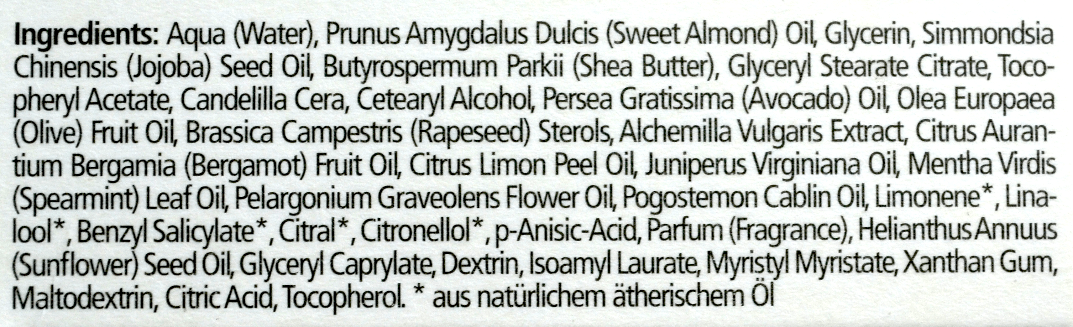 Erste Zutat ist Wasser. Es dient nicht nur als Lösungsmittel sondern auch um in die Haut einzudringen und von den verwendeten Ölen und Wachsen in dieser eingeschlossen zu werden. So verbleibt es länger in der Haut und entweicht langsamer. Shea Butter bewahrt unsere Haut sehr gut vor transepidermalem Wasserverlust, weshalb das Versprechen zur Feuchtigkeitsbewahrung sicherlich treffend ist. Auch vorhanden: ein Antioxidans. Tocopheryl Acetat (ein Vitamin-E-Derivat) schützt vor freien Radikalen und kann somit der Hautalterung etwas entgegen wirken. Nun kommen wir leider zu den vielen ABERS. Zitrusöle und Pfefferminzöl kann man hier auch vorfinden. Erstere können die lichtbedingte Hautalterung sogar beschleunigen, wenn man sich UV-Strahlung aussetzt. Und man bedenke: Kaum eine Frau trägt täglich Sonnenschutz auf. Pfefferminzöl (Mentha Virdis Leaf Oil) hat ein gewisses Irritationspotenzial, genauso wie Wacholderbeeröl (Juniperus Virginiana Oil). Über die inflationäre Verwendung irritierender Duftstoffe brauchen wir hier sicherlich nicht zu diskutieren. Geht gar nicht! So wundert es mich dann doch nicht, dass einige Kundinnen zurückkommen und sich über Unverträglichkeiten beschweren.