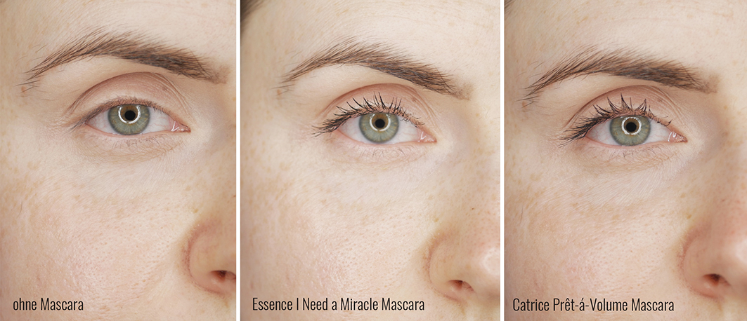 Beide Wimperntuschen kommen ohne Duftstoffe aus, sind vegan und nicht allzu kostenintensiv. Schaut man sich Onlinebewertungen beider Mascaras an, dann kommt die Catrice Prêt-á-Volume Smokey Mascara im Schnitt deutlich besser weg als das Produkt von Essence. Ich habe tatsächlich entgegen den Bewertungen mit der Essence I Need a Miracle Mascara ein viel besseres Ergebnis erzielen können als mit der Tusche von Catrice. Die Essence Mascara trennt, verlängert und verdichtet meine Wimpern ganz gut – auch die sanduhrförmige Bürste hat sich nicht als nachteilig erwiesen, denn ich konnte trotzdem jedes Härchen wunderbar damit erreichen. Mit dem Produkt von Catrice konnte ich anfangs zwar auch ein schönes Ergebnis zaubern, aber das hielt nur für wenige Stunden und am Ende des Tages hatte ich schwarze Abdrücke am unteren Wimpernkranz beziehungsweise unter der Augenbraue (das ist für mich ein absolutes No-Go im Alltag).